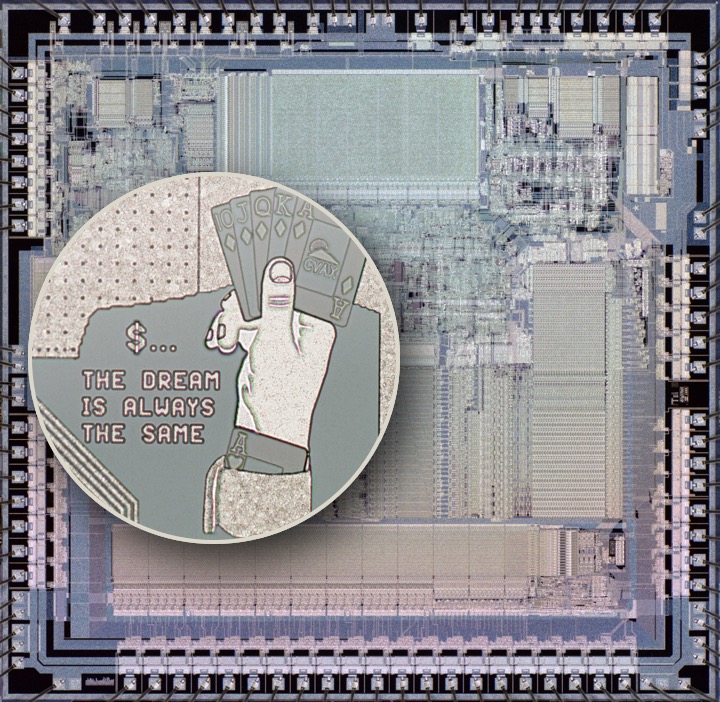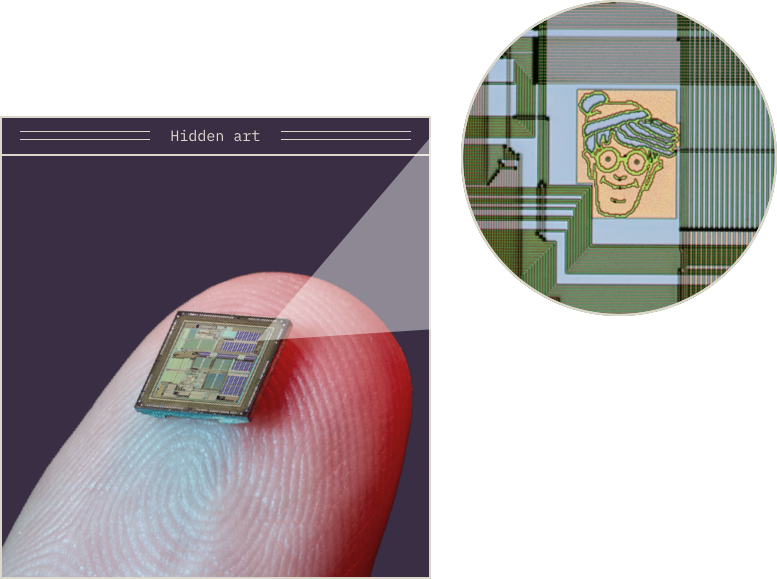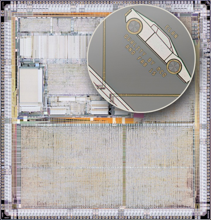 Often without management knowing, chip designers set out to create all sorts of chip art utilizing unused space on integrated circuit boards. This was a cool way for them to both express their creativity and place their signature on their work.